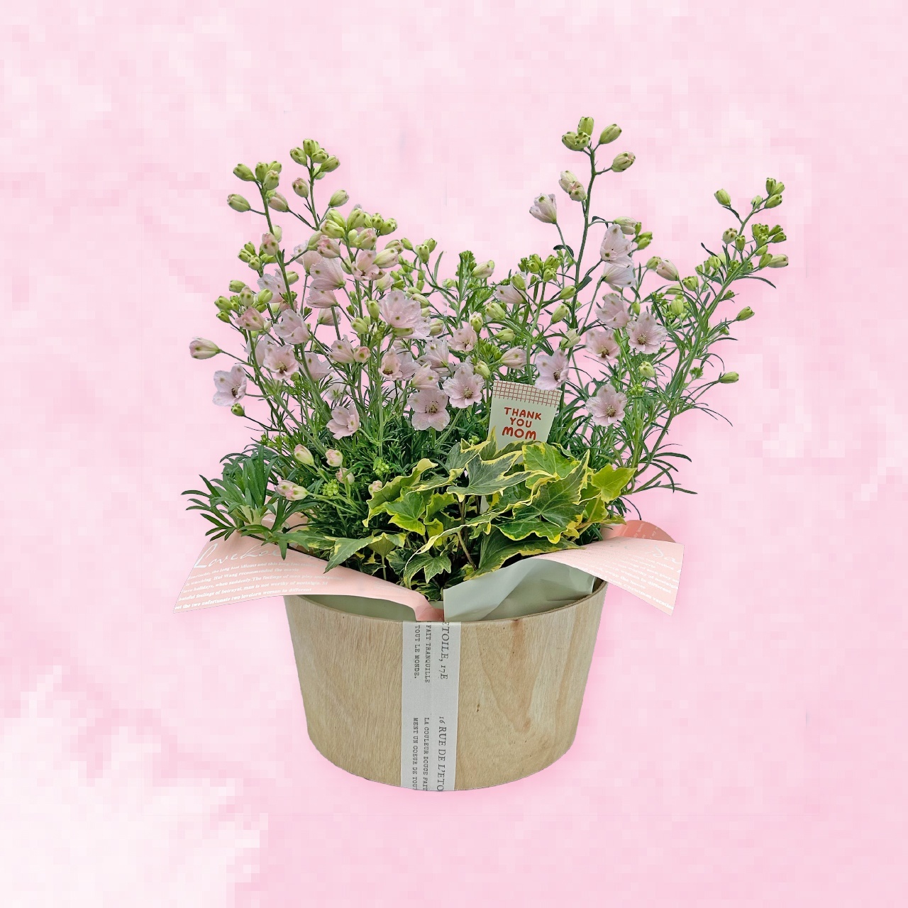 愛媛県が長い歳月を掛けて開発した、桜色のデルフィニウム『さくらひめ』を二鉢とグリーン(アイビー)を組み合わせた寄せカゴです。